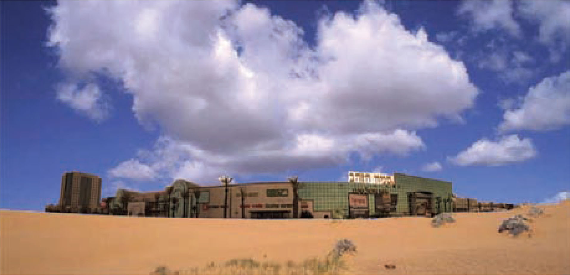קניון הזהב בים החולות. דימוי שיצר אדריכל אלעד הורן במסגרת פרוייקט הגמר שלו 'קניונים מתאבדים' שעסק בטרנספורמציה אפשרית של קניון הזהב במערב ראשון. הפרוייקט נעשה בבצלאל בהנחיית האדריכלים יהושע גוטמן, אירית כוכבי, אסנת תדמור ורוני בורג.