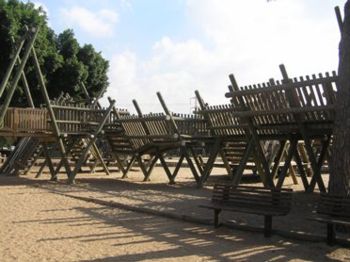 המתקנים לילדים העשויים מבולי עץ – רעיון ומעניין ומקורי בזמנו – קיבלו אומנם טיפול של מהנדס בטיחות במסגרתו הוספו להם מיני מעקות שונים שלא תורמים לעיצוב המקורי, אך לא זכו לשום חידוש משמעותי.
